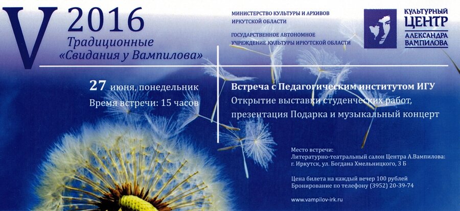 Слова благодарности от дирекции центра стали заключительным аккордом «Свиданий у Вампилова»: «V Традиционные «Свидания у Вампилова» открылись 27 июня 2016 года встречей с гуманитарно-эстетическим факультетом Педагогического института ИГУ. Вечер волшебной музыкой органично дополнили студенты с концертом «Музыка всюду живёт!», подготовленным под руководством своих замечательных преподавателей. Благодарим вас за участие в событии! Вокальное и инструментальное исполнение номеров музыкантами, в числе которых были лауреаты престижных конкурсов, гостям Центра А.Вампилова запомнится надолго! Творчества вам, вдохновенного развития!»